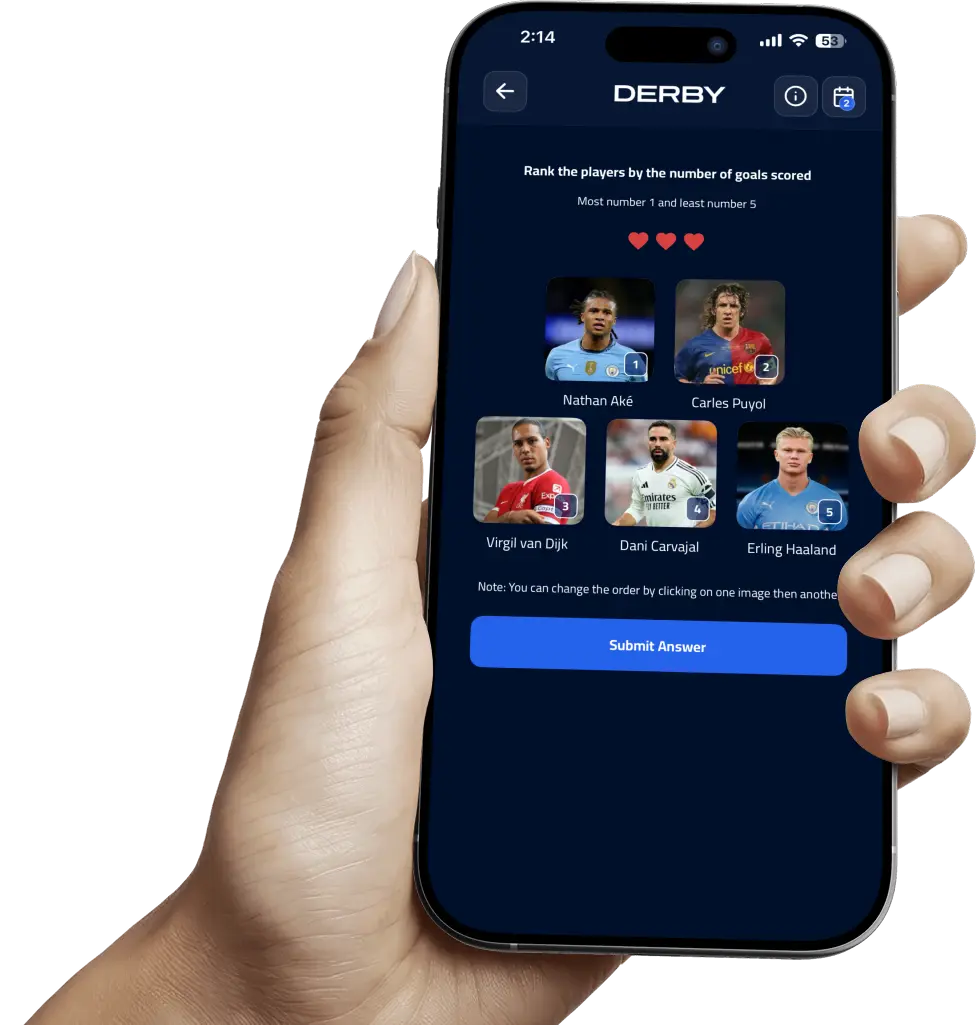 ديربي بيعطي كل محبين الكرة مساحة يختبروا فيها معرفتهم كل يوم. لعب مجاني بدون حدود، واشتراك بيفتح لك ألعاب حصرية جديدة، وأطوار أونلاين وجماعية، وسحوبات على جوائز حقيقية.